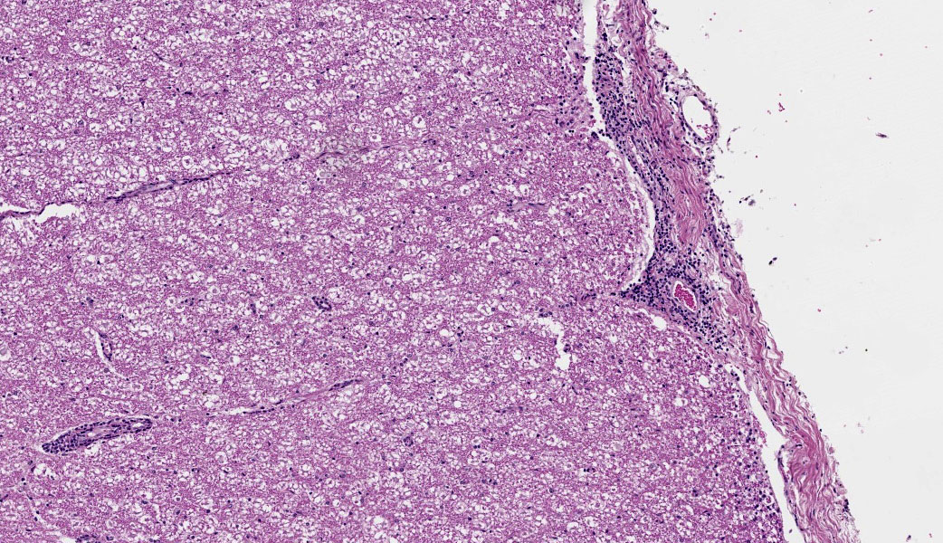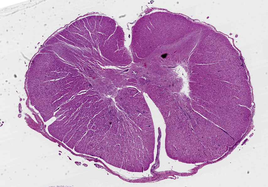 Cervical spinal cord: In the gray matter and white matter, there are scattered, variably discrete, random multifocal, mild to moderate, infiltrates of neutrophils and mononuclear cells, consistent with microabscesses. There is neuronal degeneration, spongiosis, microgliosis, and swollen axons. Blood vessels are lined by plump endothelial cells and have perivascular mild to moderate infiltrates of predominantly lymphocytes, with fewer admixed neutrophils and infrequent plasma cells. The leptomeninges are multifocally expanded by mild to moderate infiltrates of lymphocytes with infrequent admixed neutrophils.
