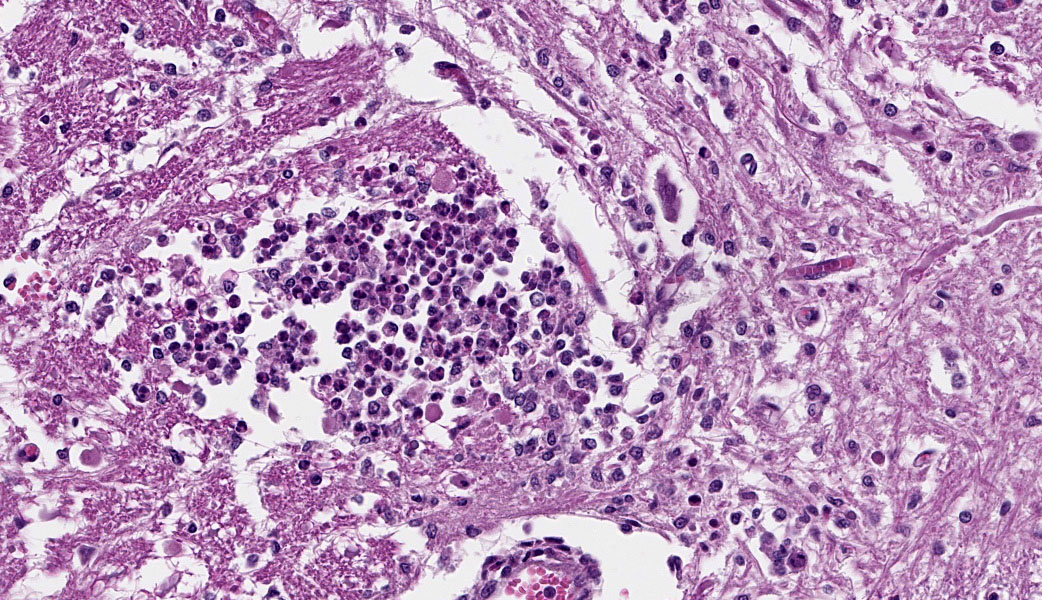 Brain, cerebellum and brainstem: In the brainstem gray matter, there are random multifocal, mild to moderate, variably discrete, infiltrates of hypersegmented and fragmented neutrophils, admixed with fewer mononuclear cells, consistent with microabscesses. Brainstem neurons within and adjacent to the neutrophilic infiltrates are pale, with central chromatolysis, consistent with neuronal degeneration. There are scattered microglial cells, mild gray matter spongiosis and infrequent microhemorrhages. Scattered blood vessels are lined by plump endothelial cells and have perivascular mild infiltrates of predominantly lymphocytes, with fewer neutrophils (perivascular cuffs). The cerebellar leptomeninges are multifocally, mildly infiltrated by predominantly lymphocytes, with fewer admixed neutrophils.