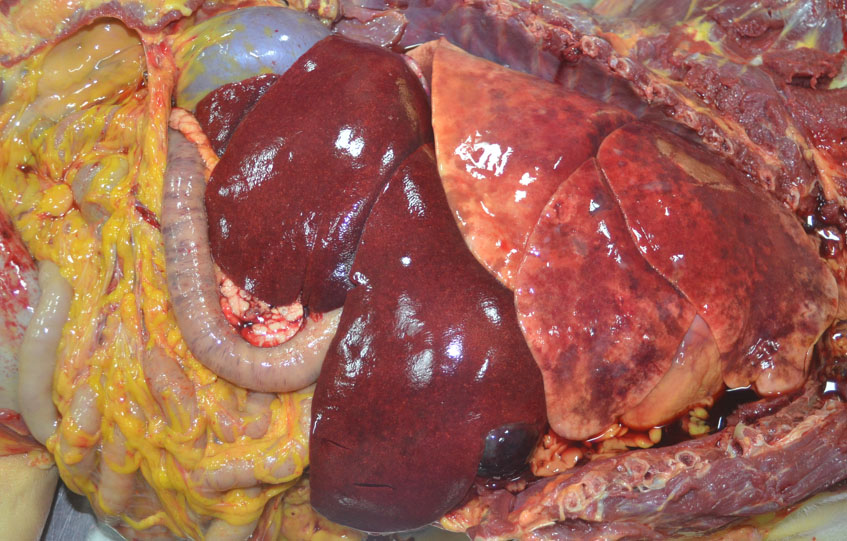 There was generalized icterus including the skin, mucus membranes, subcutaneous and mesenteric adipose tissue, fascia, and sclera, as well as petechiae and ecchymoses. The liver was enlarged, dark red and granular. There were multiple gastric mucosal ulcers, and melena throughout the gastrointestinal tract.