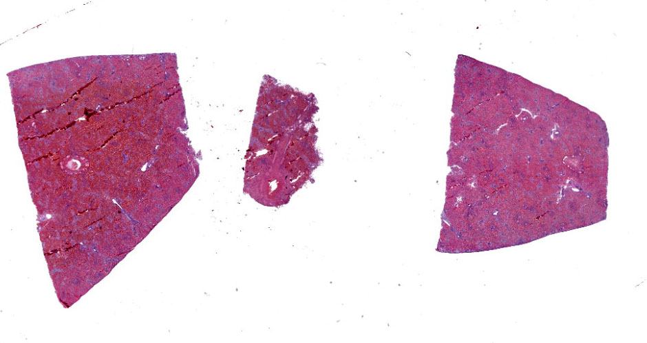 Liver: There is massive loss of hepatocytes in all examined sections with approximately 99% of the hepatic parenchyma affected. The portal regions contain scant numbers of remaining hepatocytes with large numbers of macrovesicular and microvesicular lipid vacuoles. Kupffer cells and occasional hepatocytes contain moderate amounts of yellow brown pigment (lipofuscin). There is moderate proliferation of oval cells, which have large open nuclei with a prominent nucleolus. There are increased numbers of circulating neutrophils and monocytes within the sinusoids.