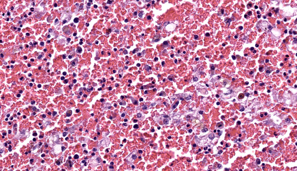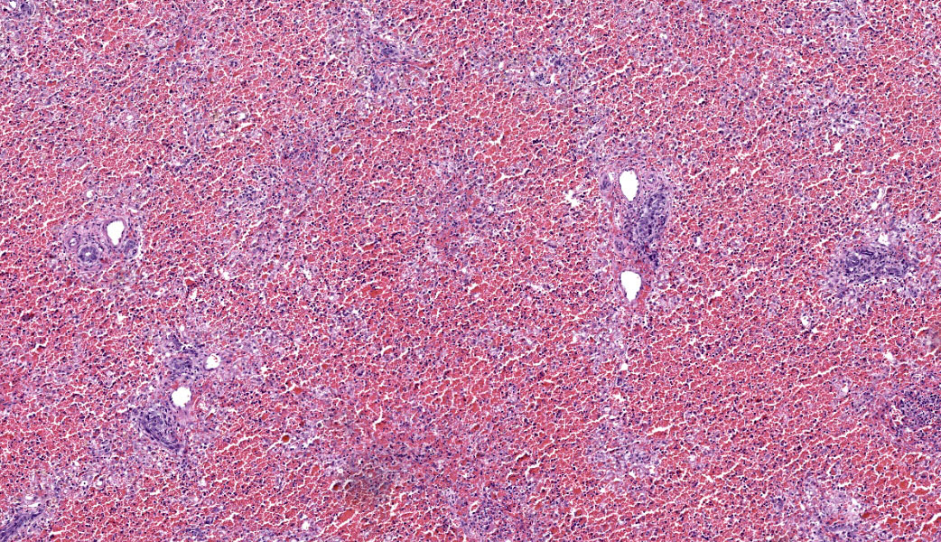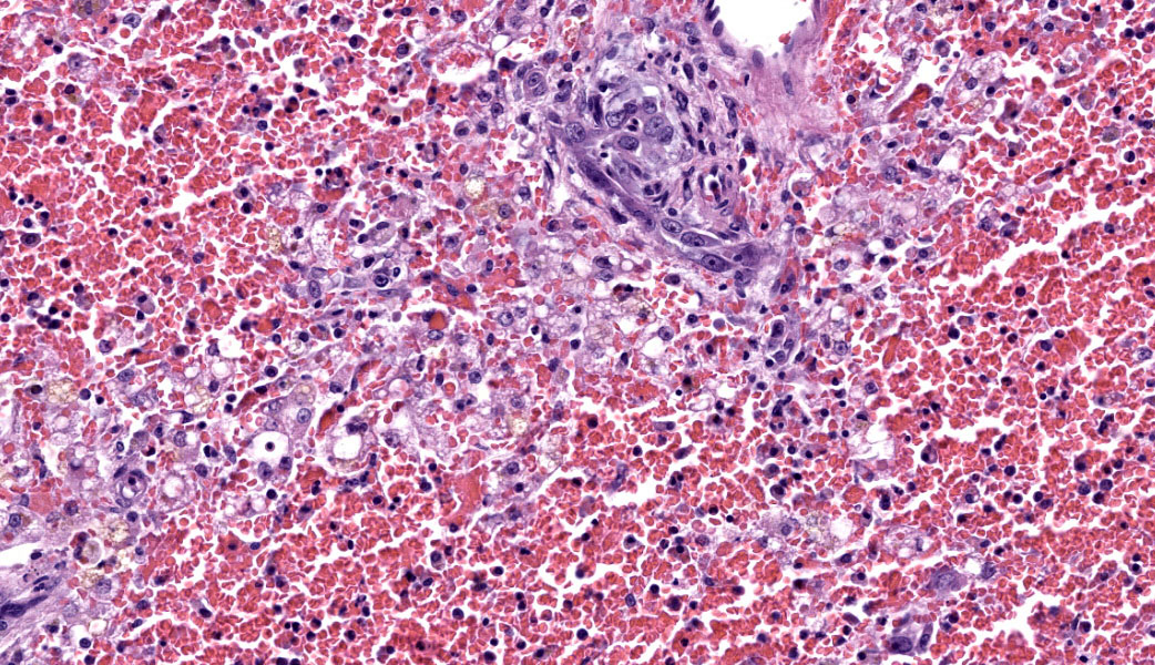 This contributor also provides an outstanding comment on this entity, which represents a case of acute hepatic necrosis secondary to a toxin in a dog. Much of what was discussed in conference for this case is covered in their write-up. Hepatic damage by cycad palm is progressive and dose-dependent.9 Dr. Whitten discussed the acute changes seen in toxicity cases such as this, which include centrilobular hemorrhage & massive hepatocellular coagulative necrosis, vacuolar degeneration, hepatic venous congestion, pigmentary bile duct distention, bile duct plugging, and intracanalicular cholestasis.