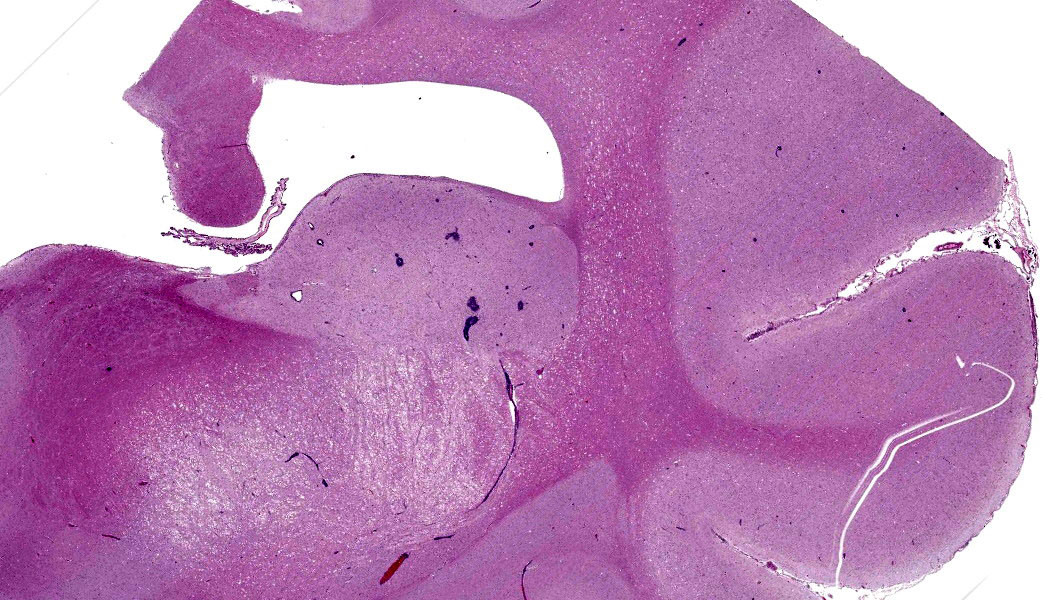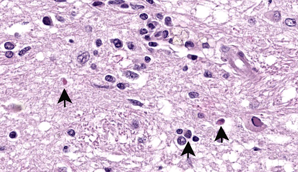 Wrapping up this conference was a stunning case of canine morbillivirus with readily identifiable viral inclusions. Canine distemper virus is a top infectious cause of demyelinating injury in dogs. This is due to direct infection and destruction of glial cells, such as oligodendrocytes (primary myelinating cell of the CNS), astrocytes, and microglia.3,5 CDV can also infect neurons, including Purkinje's cells and granular cells.3 The cerebellum is consistently affected in cases of CDV, with demyelinating lesions in the cerebellar white matter. Other common sites for similar lesions include the periventricular white matter (especially around the 4th ventricle) and the optic pathways.3 Occasionally, the white matter of the spinal cord may be involved. The Pesavento Lab also performed IHC on this case and was able to readily demonstrate the virus within glial cells and neurons in this case.