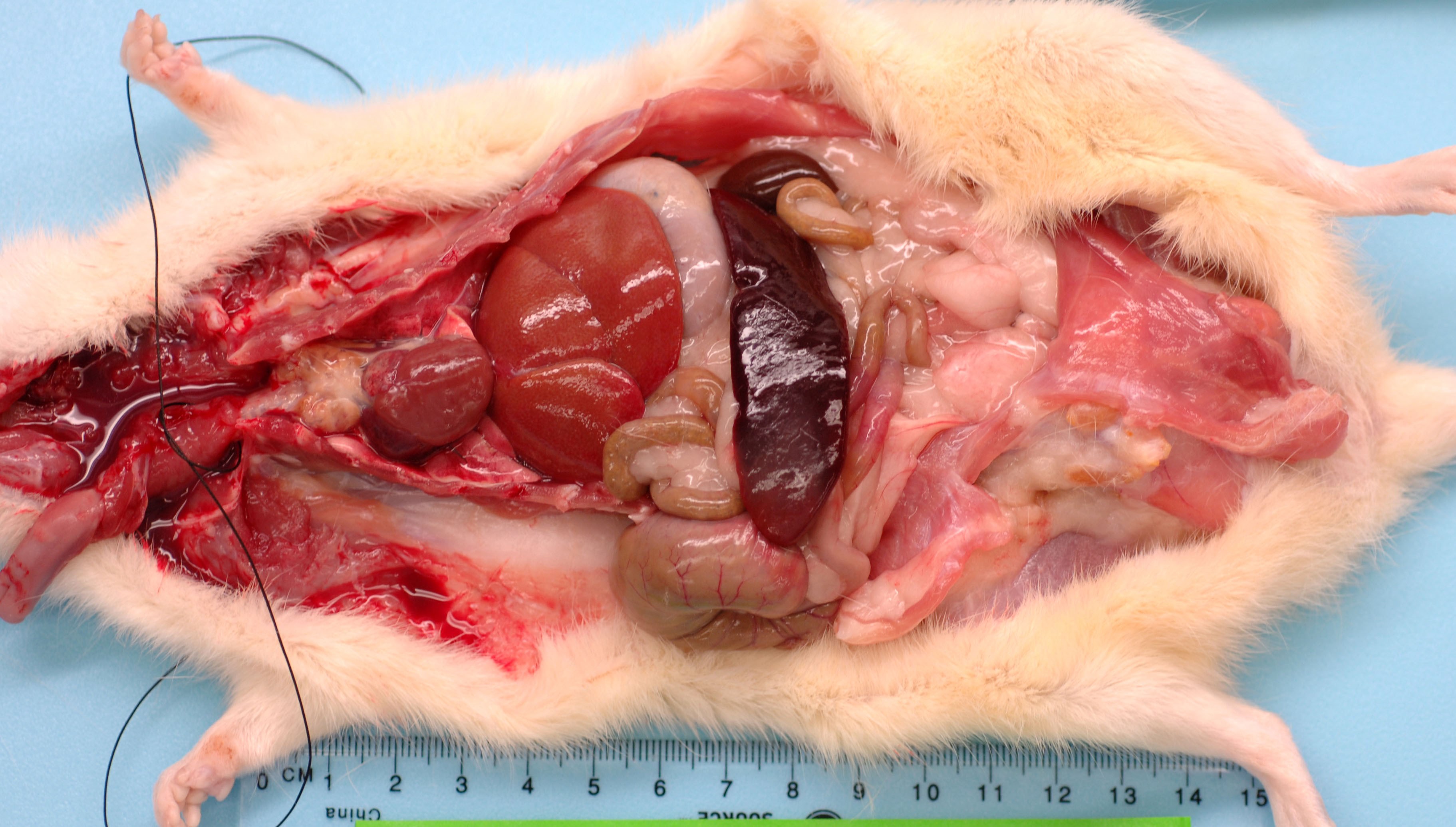 The rat had telemetry placement surgery on 8 June 2015. Post-operative treatments included meloxicam, buprenex along with supplemental feeding. Animal recovered from surgery without complication and was acting normally during the initial post-surgery period. On the 26th of June, the rat appeared pale and lethargic and euthanasia was elected.