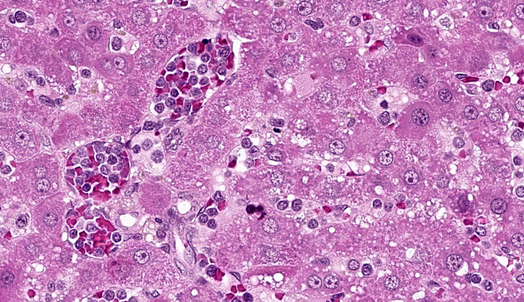 Histological findings, in general, include diffuse infiltration of the splenic red pulp sinusoids of variable density, infiltration of the hepatic sinusoids with variable centrilobular hepatocellular degeneration, and necrosis and atrophy of hepatic cords and infiltration of the alveolar septa of the lungs.7 Other tissues affected include lymph nodes, adrenal gland, kidney, and bone marrow.