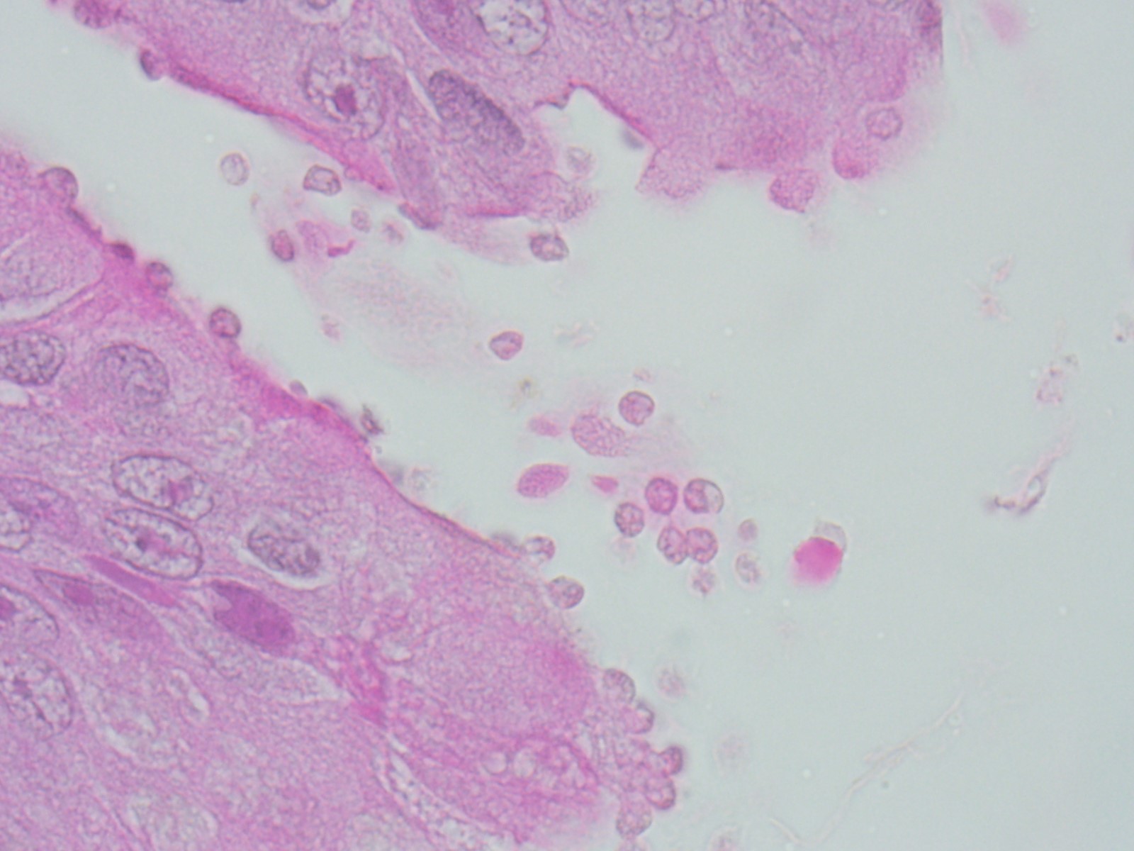 Lining the apical and luminal epithelium and free within the lumen are multiple 2-6 um diameter, round, pale amphophilic to basophilic protozoa with variably distinct 1-2 um basophilic nuclei.