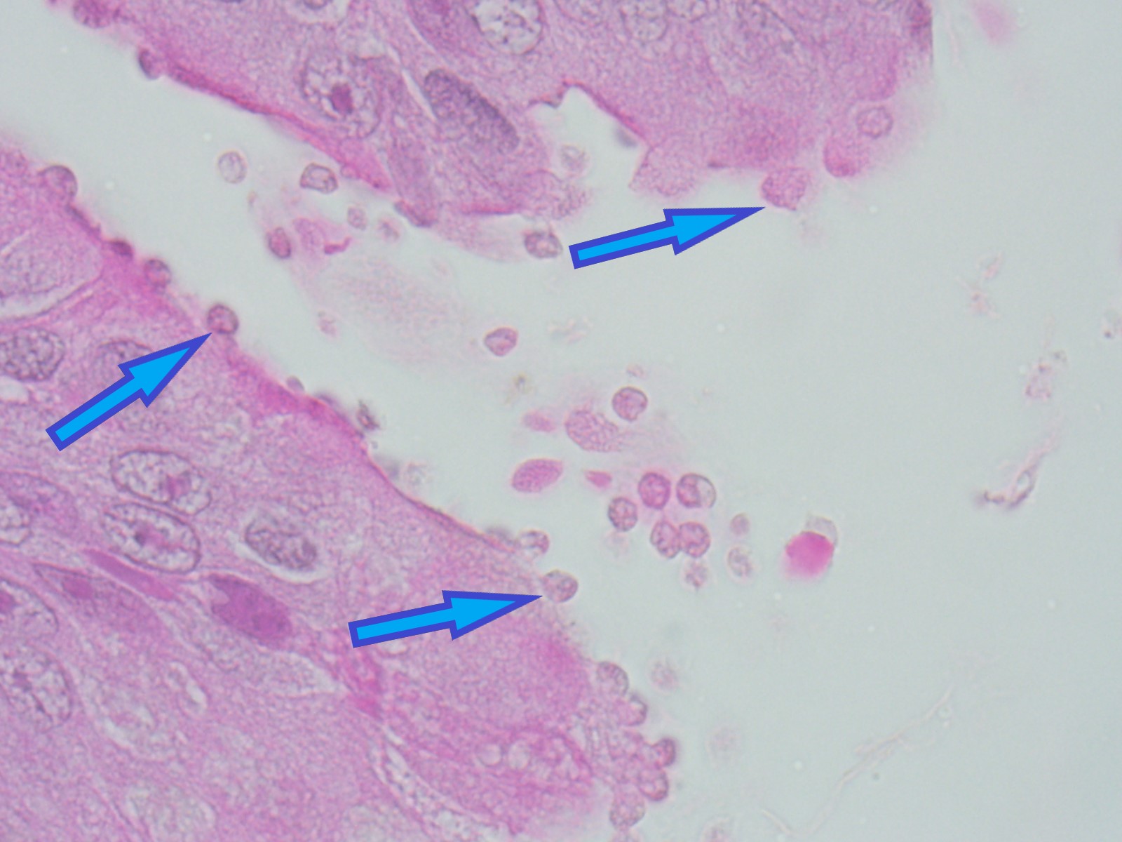 Lining the apical and luminal epithelium and free within the lumen are multiple 2-6 um diameter, round, pale amphophilic to basophilic protozoa (arrows) with variably distinct 1-2 um basophilic nuclei.