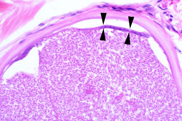 The hyaline capsule is 20-30um thick, surrounds a rim of cytoplasm from the host cell (arrowheads). In the center are numerous 3-5um, crescentic bradyzoites.