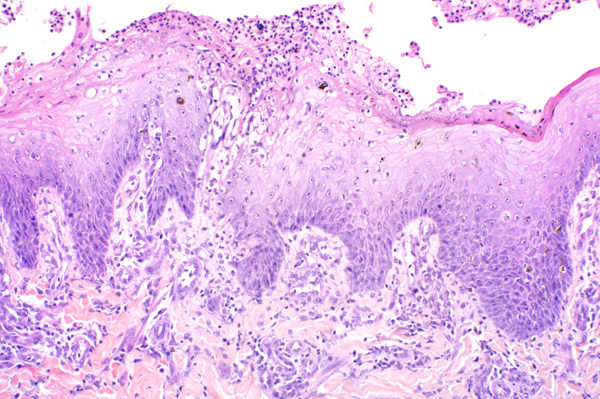 The epithelium is ulcerated and the dermis is infiltrated by inflammatory cells.