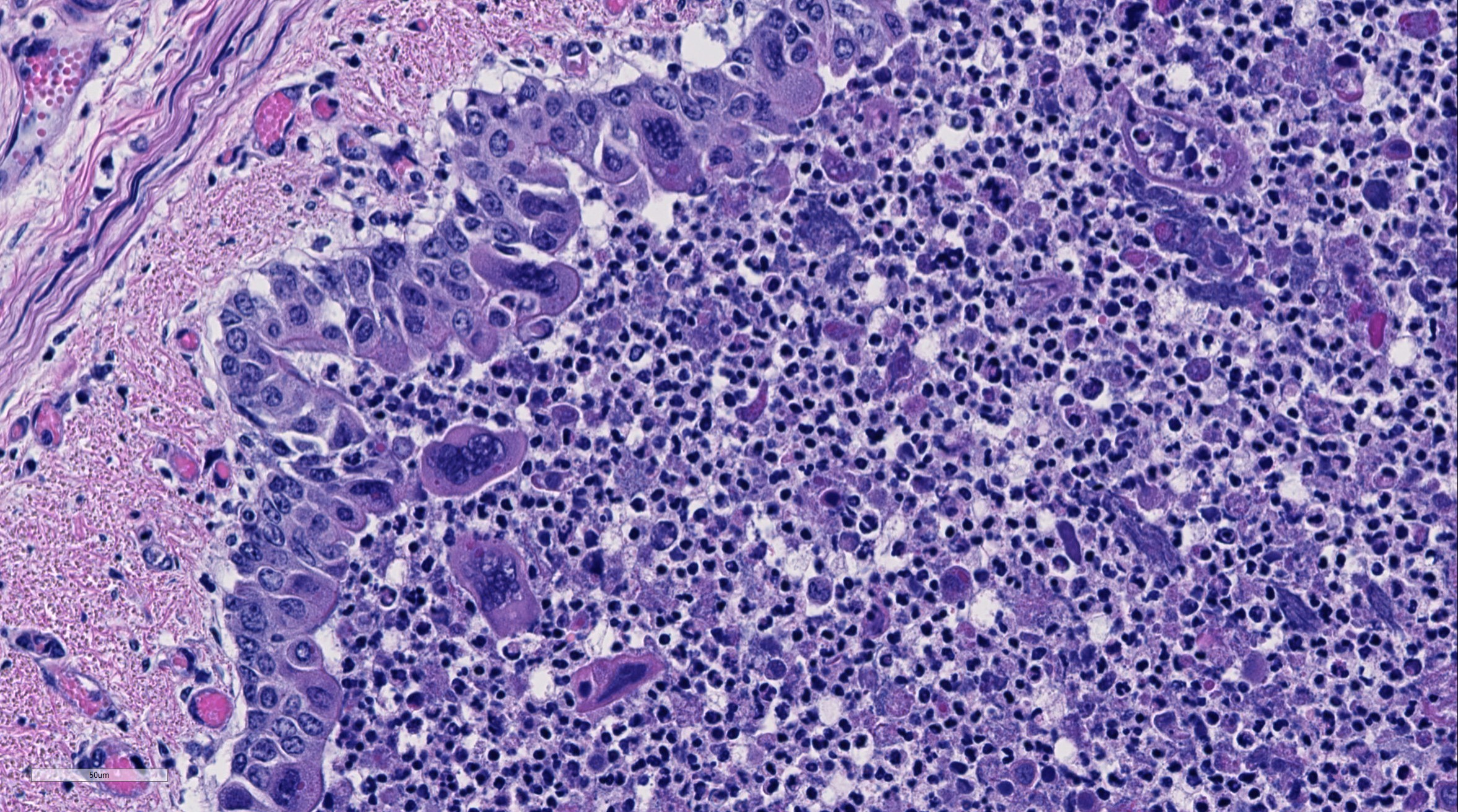 The exudate is composed of viable and degenerate neutrophils, eosinophilic cellular and karyorrhectic debris, alveolar macrophages, sloughed epithelial cells, fibrin, hemorrhage, and edema. The bronchus epithelium is characterized by one or more of the following changes: epithelial necrosis, hyperplasia, and viral syncytial cell formation(green arrows) with cells budding off the epithelium into the lumen (blue arrows). Multifocally, there are 3-6 um, round to oval, brightly eosinophilic intracytoplasmic inclusion bodies (orange arrows) in respiratory epithelium and syncytial cells.