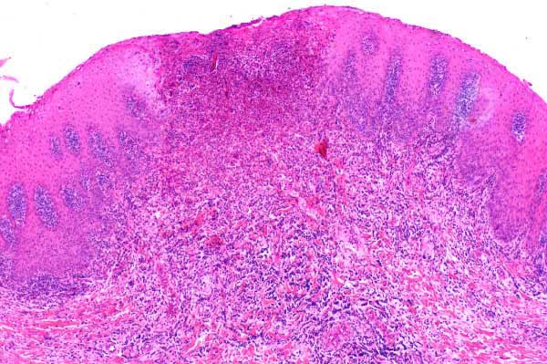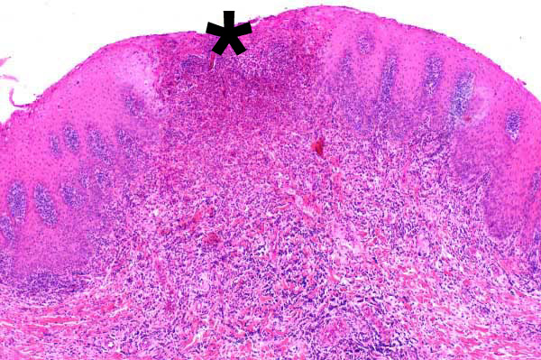 There is a cellular infiltrate within the dermis. The epithelium is diffusely hyperplastic, and is focally ulcerated (*).