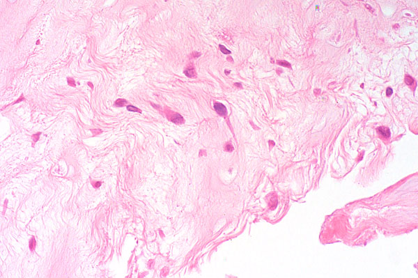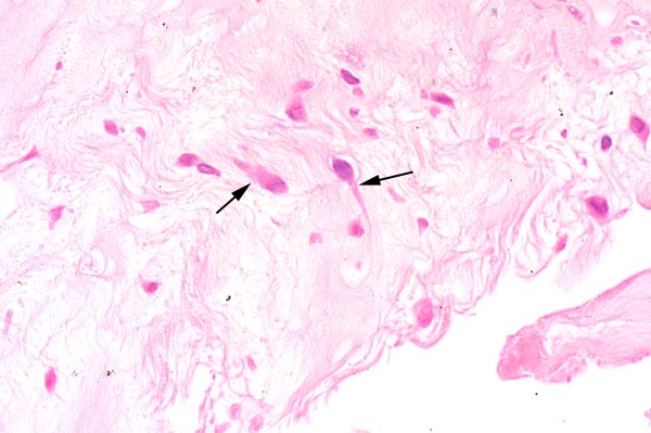 There are multifocal spindle cells (fibroblastic metaplasia) (arrows).