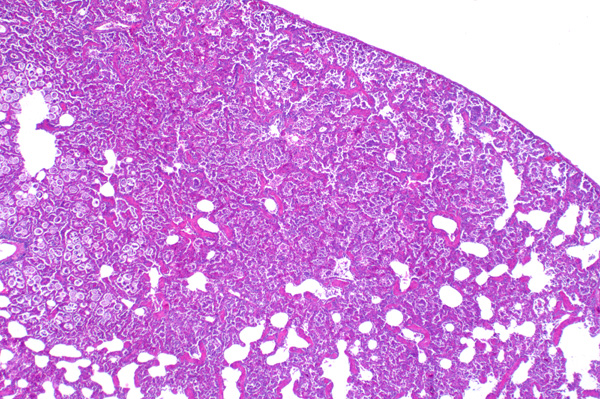 Inflammation fills alveoli and alveolar septa are prominent.