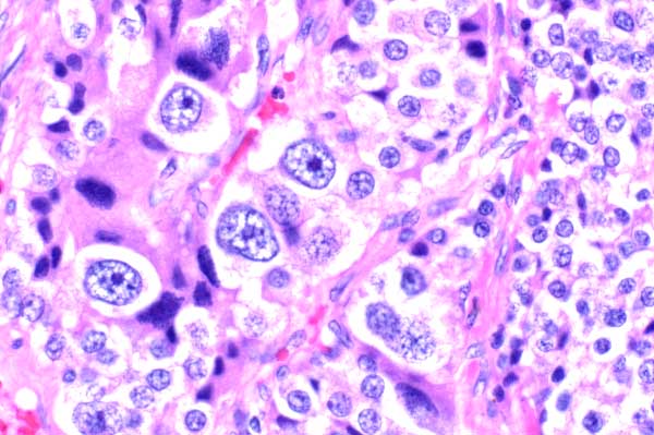 There is prominent anisocytosis and anisokaryosis, with rare cells having large nuclei with vesiculate chromatin and a large nucleolus.