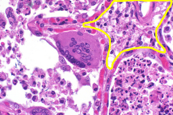 There are many syncytial cells that contain up to 20 nuclei. The surrounding interstitium (circled) is expanded by fibrin and edema, degenerate neutrophils, and eosinophilic cellular and karyorrhectic debris.