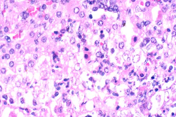 A few adrenal cortical cells are shrunken, with intensely eosinophilic cytoplasm and a pyknotic nucleus (necrosis)(arrows). Remaining cortical cells are swollen with vacuolated cytoplasm (degeneration). There are a few neutrophils.