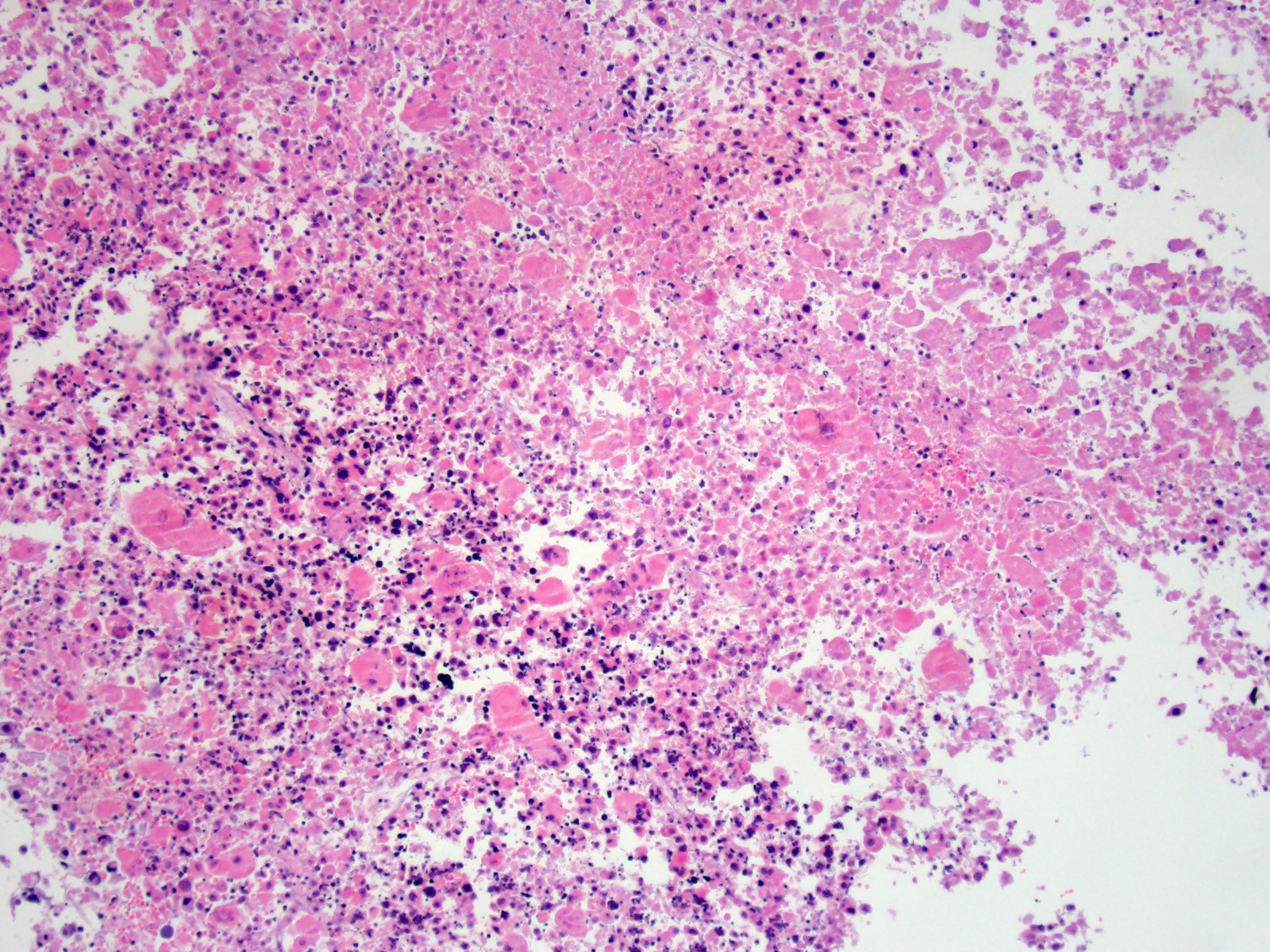 Higher magnification view of necrotic debris, degenerate neutrophils, fibrin and hemorrhage.