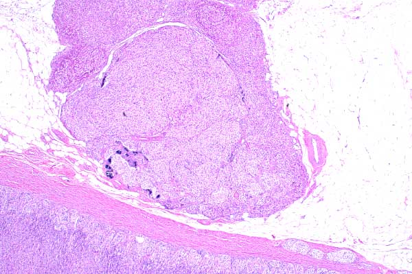 There is an extracapsular and an intracapsular nodule of adrenal cortical cells.