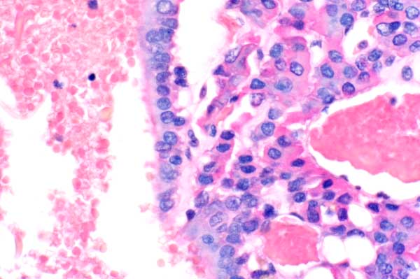 The epithelium lining the cyst is cuboidal to columnar, and is multifocally ciliated (arrow).