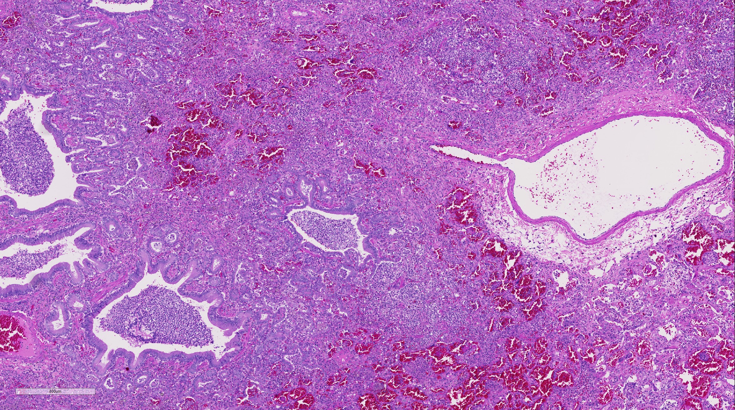 Lung: Bronchi and bronchilar lumina contain a hemorrhagic cellular exudate, bronchiolar epithelium is hyperplastic, and there is perivascular edema.