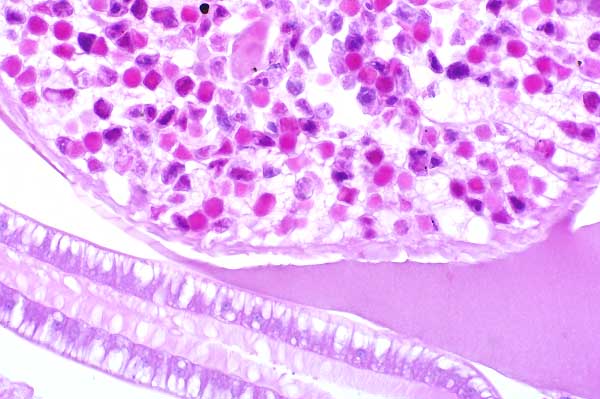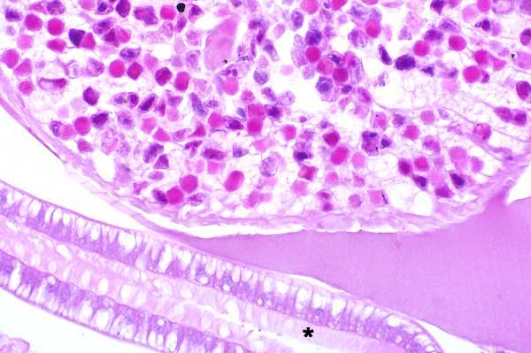 Digestive tract is lined by many uninucleate columnar epithelial cells with long, prominent microvilli (brush border)(*).