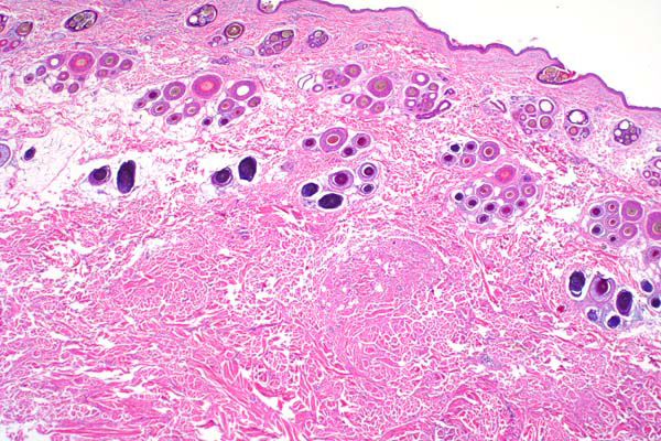 The dermis is expanded by eosinophilic, irregular, collagenous stroma.
