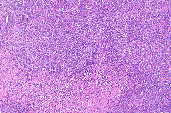 Areas of necrosis occasionally disrupt the sheets of polygonal neoplastic cells.
