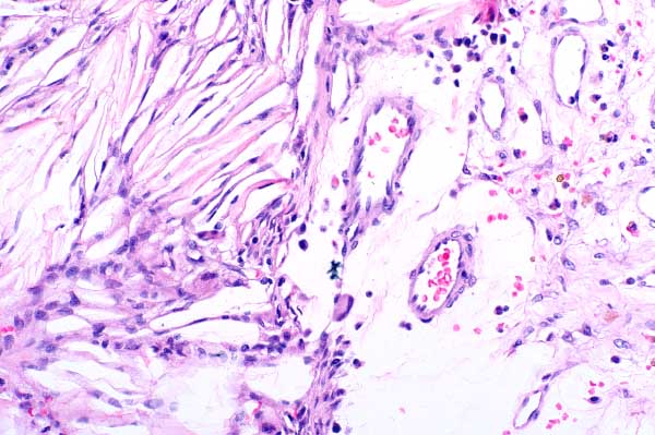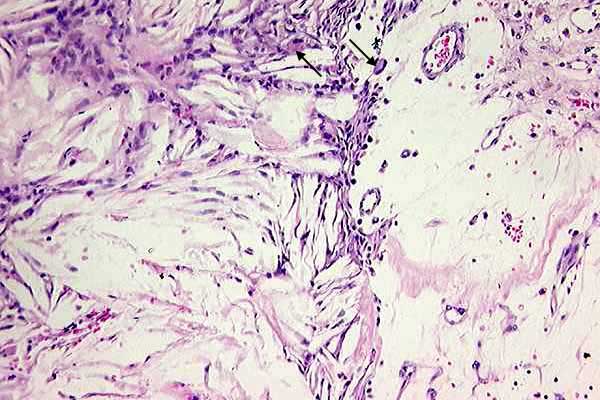 Cholesterol clefts are surrounded by macrophages (sometimes forming multinucleated giant cells (arrows)).
