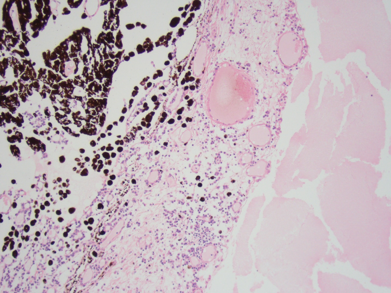 Higher magnification view of preiridal fibrovascular membrane composed of large vascular channels, fibroblasts and loose fibrous connective tissue infiltrated by lymphocytes and plasma cells.