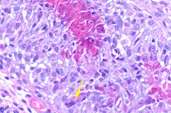 These foci are surrounded by abundant macrophages (sometimes forming multinucleated giant cells (arrow)), eosinophils, neutrophils, lymphocytes and mast cells.
