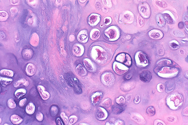 Nuclei are oval, or pleomorphic, with finely stippled chromatin and 1-2 lightly magenta nucleoli.