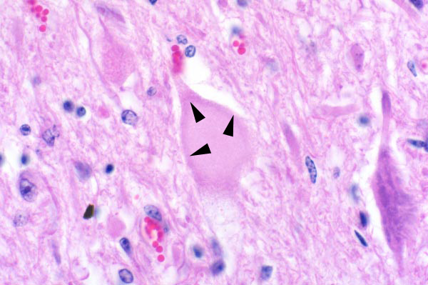 Degenerate neurons are swollen with abundant, pale eosinophilic cytoplasm and marginated Nissl substance (central chromatolysis) (arrowheads) . Capillaries are diffusely congested and lined by reactive endothelial cells.