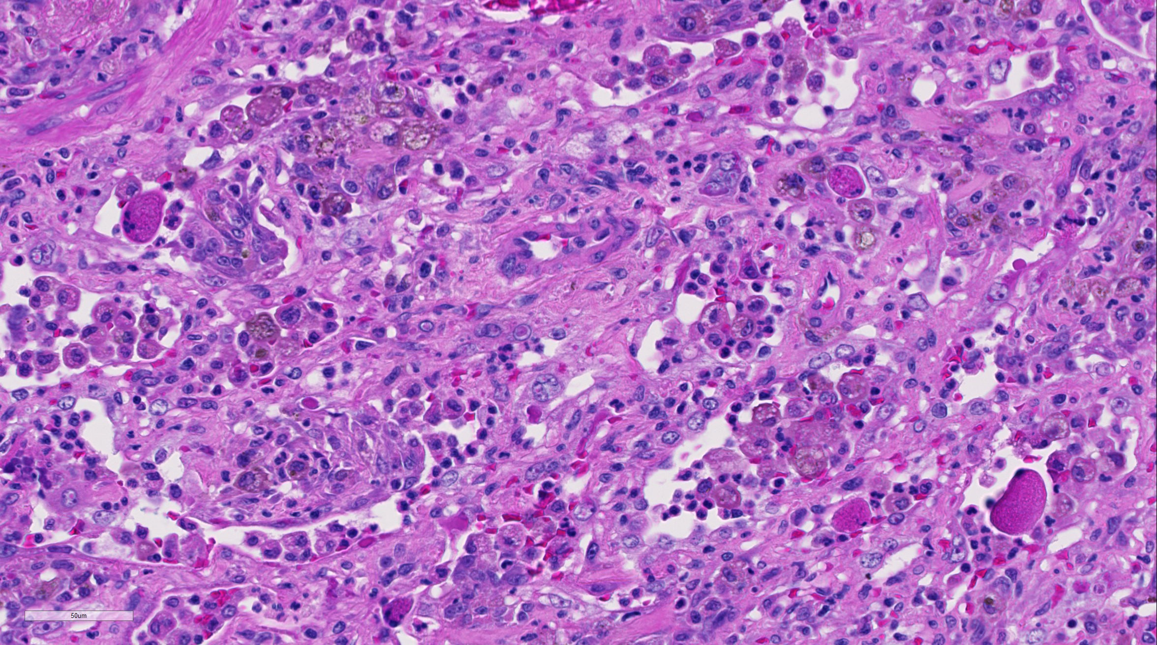 Lung: There is alveolar type II pneumocyte hyperplasia and pneumocytes are often multinucleated with up to eight nuclei (viral syncytia) and frequently contain 4um eosinophilic intracytoplasmic and intranuclear inclusion bodies; these syncytial cells are often hypereosinophilic with karryorhectic nuclei (necrosis) and have been sloughed into alveolar lumina.
