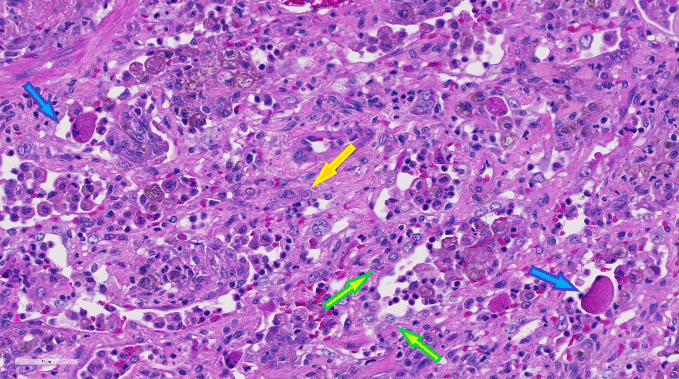 Lung: Alveolar type II pneumocyte hyperplasia (green arrows) and pneumocytes are often multi-nucleated with up to eight nuclei (viral syncytia); syncytial cells are often hypereosinophilic with karryorhectic nuclei (necrosis) and have been sloughed into alveolar lumina(blue arrows); pneumocytes (and/or macrophages) multifocally contain 4um eosinophilic intracytoplasmic and intranuclear inclusion bodies (yellow arrow).