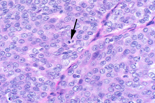 There is mild anisocytosis and anisokaryosis. Note the mitotic figure.