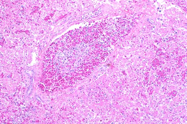 Blood vessels are congested, and their walls are disrupted by karyorrhectic debris, fibrin, erythrocytes and inflammatory cells.