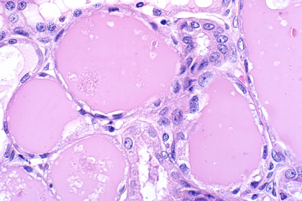 Ectatic tubules lined by attenuated, occasionally vacuolated, epithelial cells; plump, vesiculate nuclei with prominent nucleoli indicate regeneration.