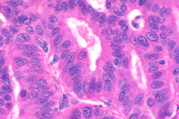 Crowded columnar cells have oval, basally oriented nuclei with finely stippled chromatin. The lumena of tubuloacini contain secretory product or sloughed cells.