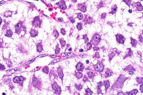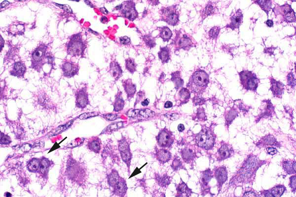 Cells have indistinct cell borders, and a small amount of fibrillar eosinophilic and vacuolated cytoplasm. Nuclei are round with finely stippled chromatin and 1-2 nucleoli. Note the binucleate cells (arrows).