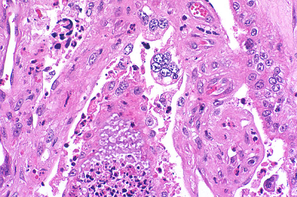 Villi are multifocally lined by large, multinucleated cells (syncytiotrophoblasts - arrow). Villar necrosis (*) is characterized by loss of normal architecture and replacement by eosinophilic cellular and karyorrhectic debris, and degenerate neutrophils.