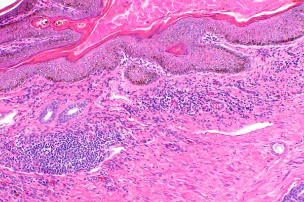 The epithelium is mildly hyperplastic and inflammatory cells infiltrate the superficial dermis.