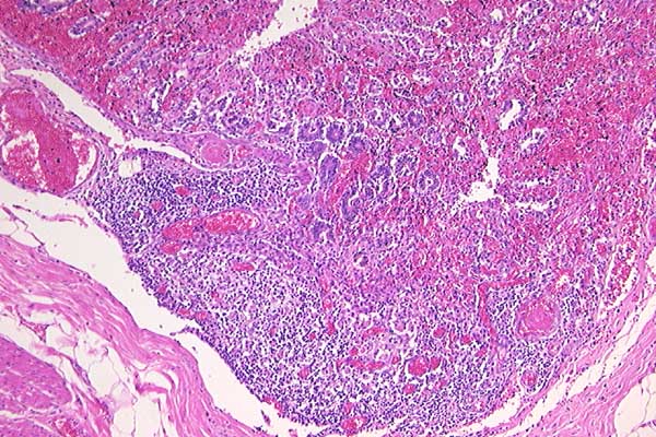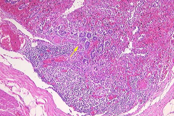 Submucosal lymphoid tissue is depleted. Focally the remaining crypts herniate through the muscularis mucosa (arrow).