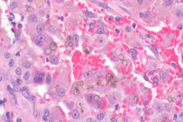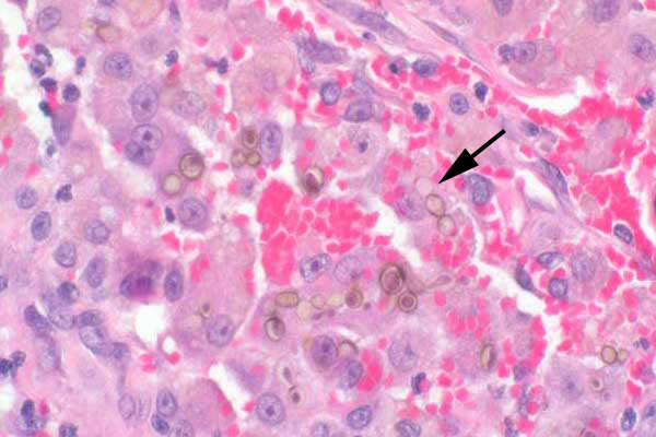 Solitary or chains (pseudohyphae) of pigmented fungi are present within macrophages (arrow).