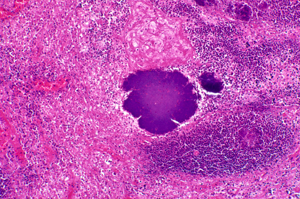 There are scattered variably-sized, large, irregularly shaped, basophilic bacterial colonies.