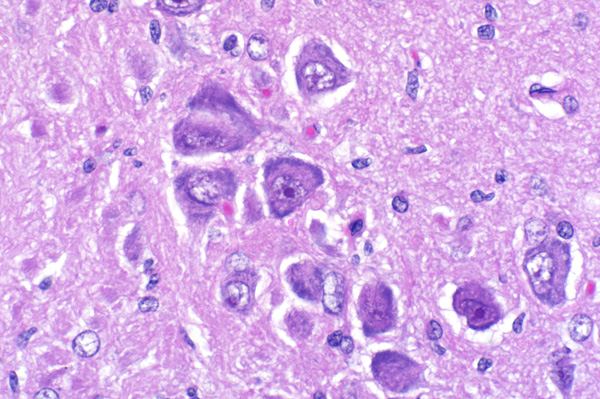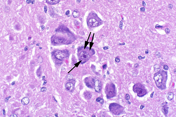 Some neurons have peripheralized Nissl substance and a "ground glass" appearance to the cytoplasm (chromatolysis) (arrows).