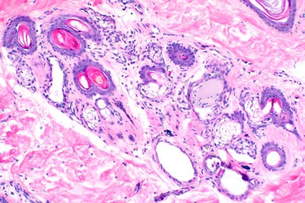 Hair follicles are sparse and apocrine glands are often ectatic.