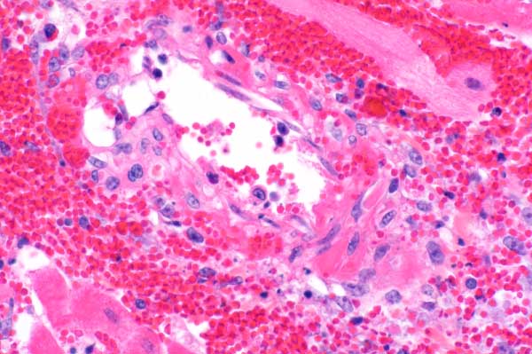 There is necrosis of endothelial cells with fibrin deposition and perivascular hemorrhage.