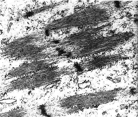 Ultrastructurally, rhabdomyosarcoma cells contain actin filaments (5 nm in width) and myosin filaments (10 nm in width) that form Z-bands, I-bands, and M-bands (see electron micrograph accompanying this case). Additionally, neoplastic cells contain abundant mitochondria and glycogen, and there are indentations of the nuclear membrane.