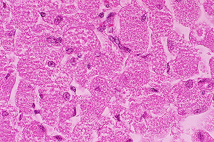 Rhabdomyomas can be differentiated from oncocytomas and granular cell tumors by special staining procedures, immunohistochemical testing, and ultrastructural studies. The granules of rhabdomyoma cells are composed of mitochondria which stain a light blue when the cells are treated with the phosphotungstic acid-hematoxylin procedure (PTAH). In addition, some of the rhabdomyoma cells contain cross-striations which also stain blue with PTAH. Rhabdomyoma cells are usually rich in glycogen which is diastase-sensitive and can be demonstrated with the periodic acid-Schiff (PAS) procedure. Rhabdomyomas are generally immunohistochemically positive for the presence of desmin and myoglobin. Ultrastructurally they contain myofilaments and form Z bands. They lack desmosomes and are separated from each other by an external lamina.