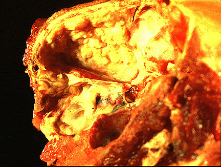 Gross Pathology: A 5 x 3 x 2.5 cm fixed larynx is received with a 2.0 cm mass adjacent to the left vocal fold. The mass is soft, necrotic and centrally cystic and does not appear to erode or arise from laryngeal mucosa.