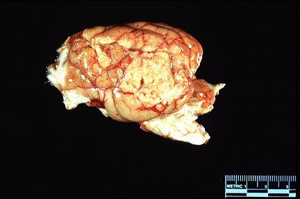 Gross Pathology: The animal had 3.0 x 4.0 cm white-tan, granular focus on the lateral aspect of the temporal lobe of the left cerebral hemisphere. This area and the meninges were adhered to the parietal and temporal bones. On cross-section, the mass compressed and invaded the cerebrum.